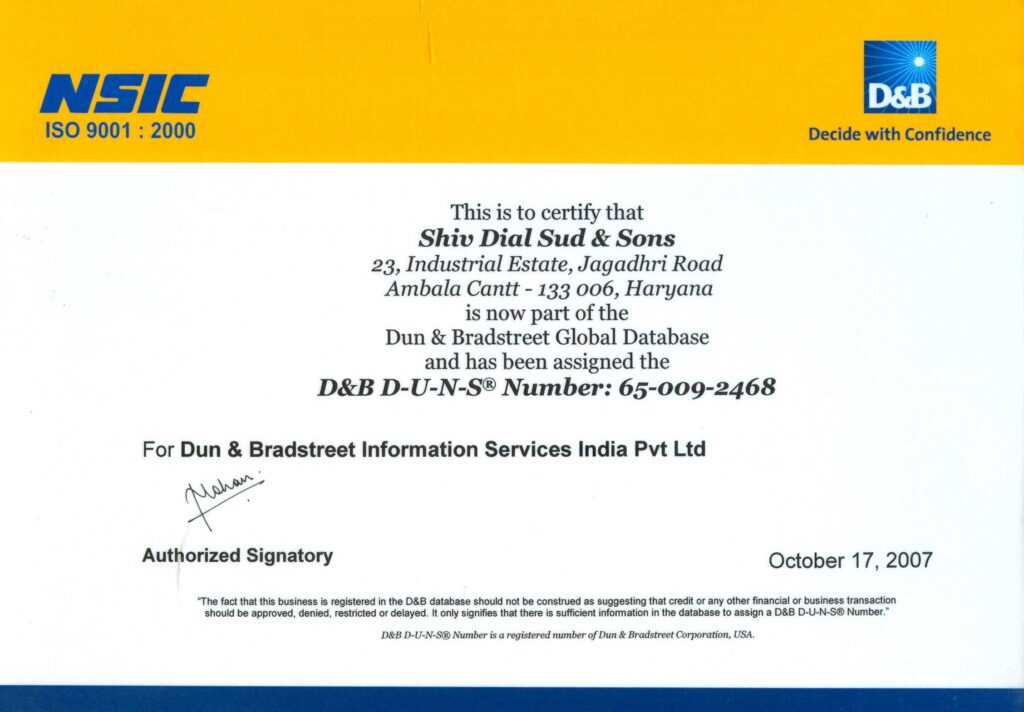 At Shiv Dial Sud and Sons, our top priority is to provide our customers across the world with world-class products and services. We are proud to hold various certifications that serve as a testament to our commitment to meeting and exceeding our customers’ expectations. These certifications provide credibility to our company and demonstrate our dedication to providing high-quality products and services.