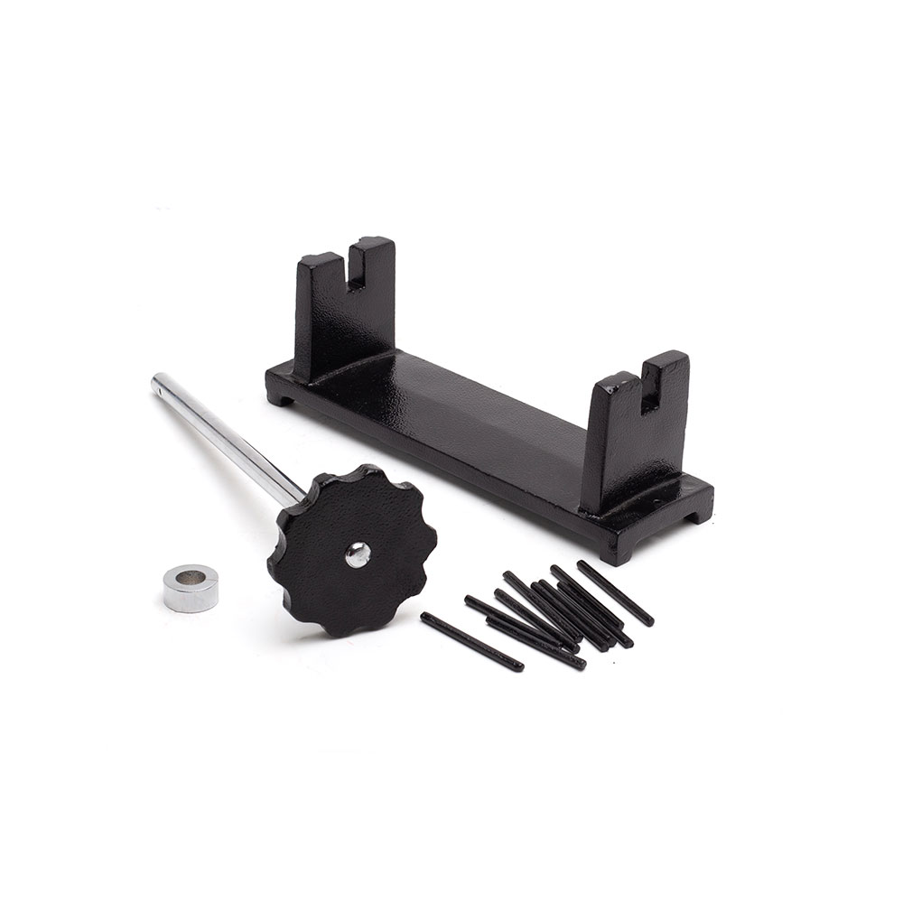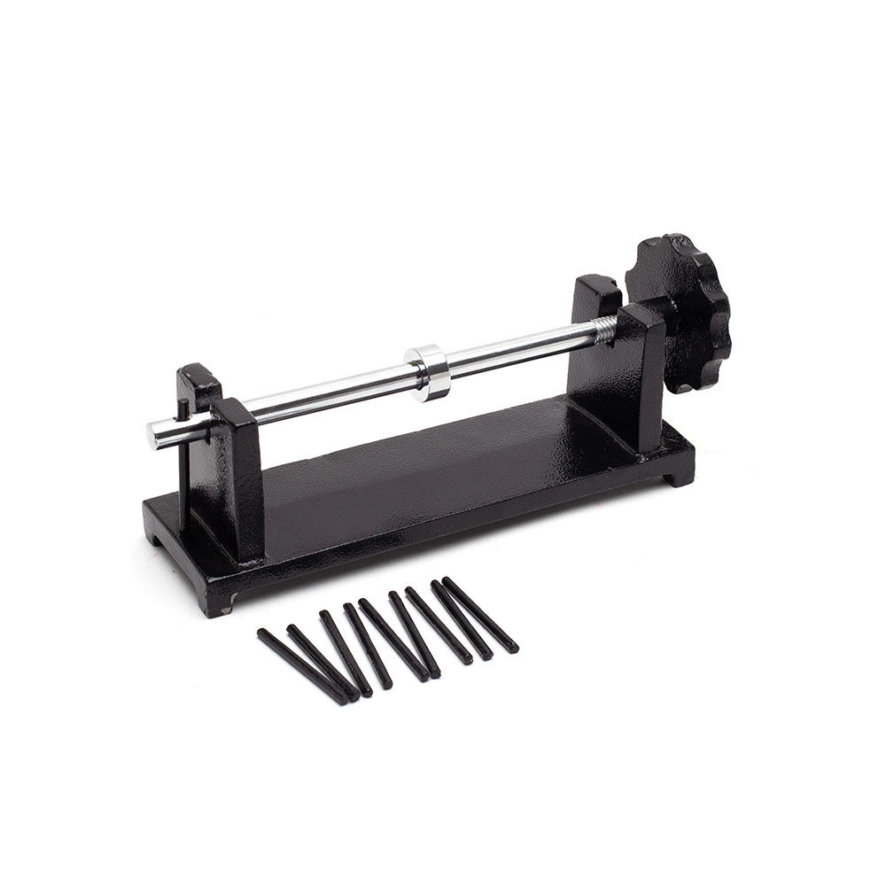 A heavy cast iron stand slotted to carry a stout iron bar, with ten cast iron breaking bars.