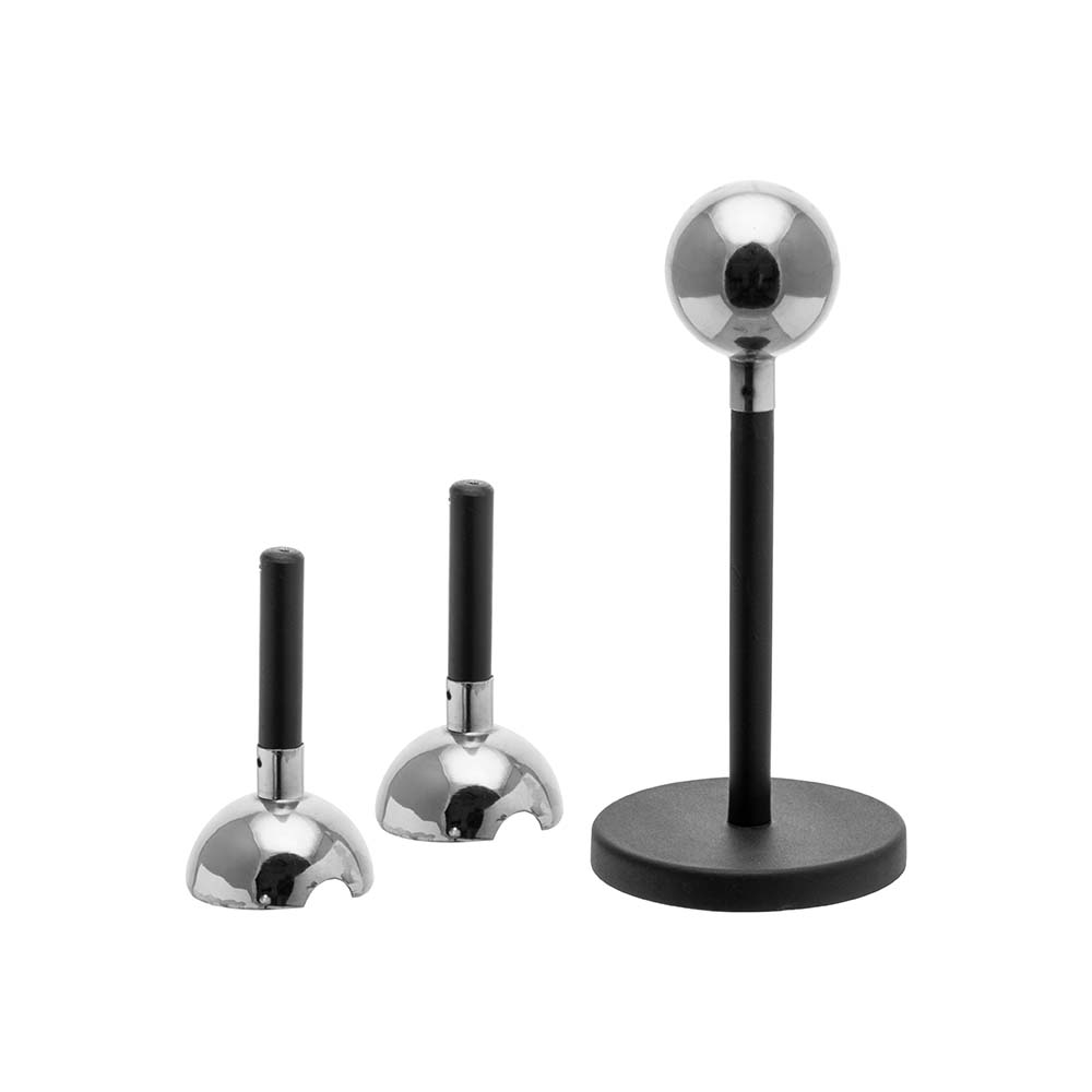 A spherical conductor on insulating stand with two hollow hemispheres, each with insulated handle, to show that electrostatic charge resides on outer surface.