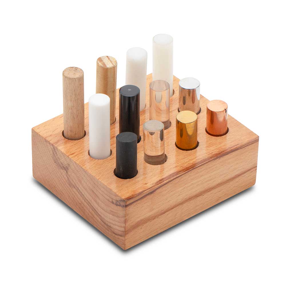 Set of different half-inch diameter specimens of varying lengths, supplied in a wood storage block. The set includes cylinders of Aluminium, Brass, Copper, Glass, Hard Rubber, Delrin, PVC, Acrylic, Teflon, Nylon, Maple and Pinewood.