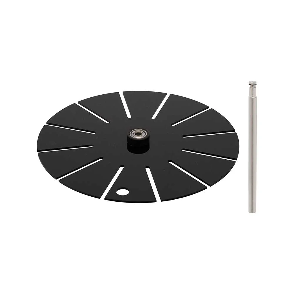 A simple device for demonstrating the stroboscopic effect. The 250 mm disc with 12 slots and central handle makes rotating objects appear stationary. No power required, ideal for basic classroom experiments.