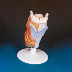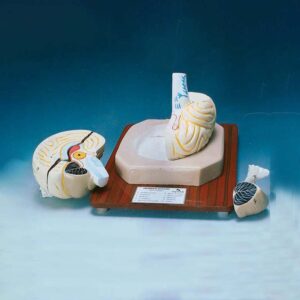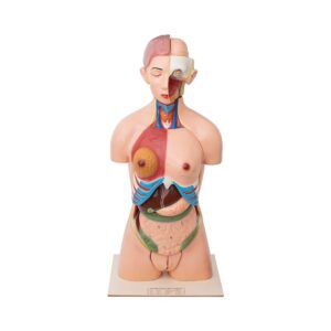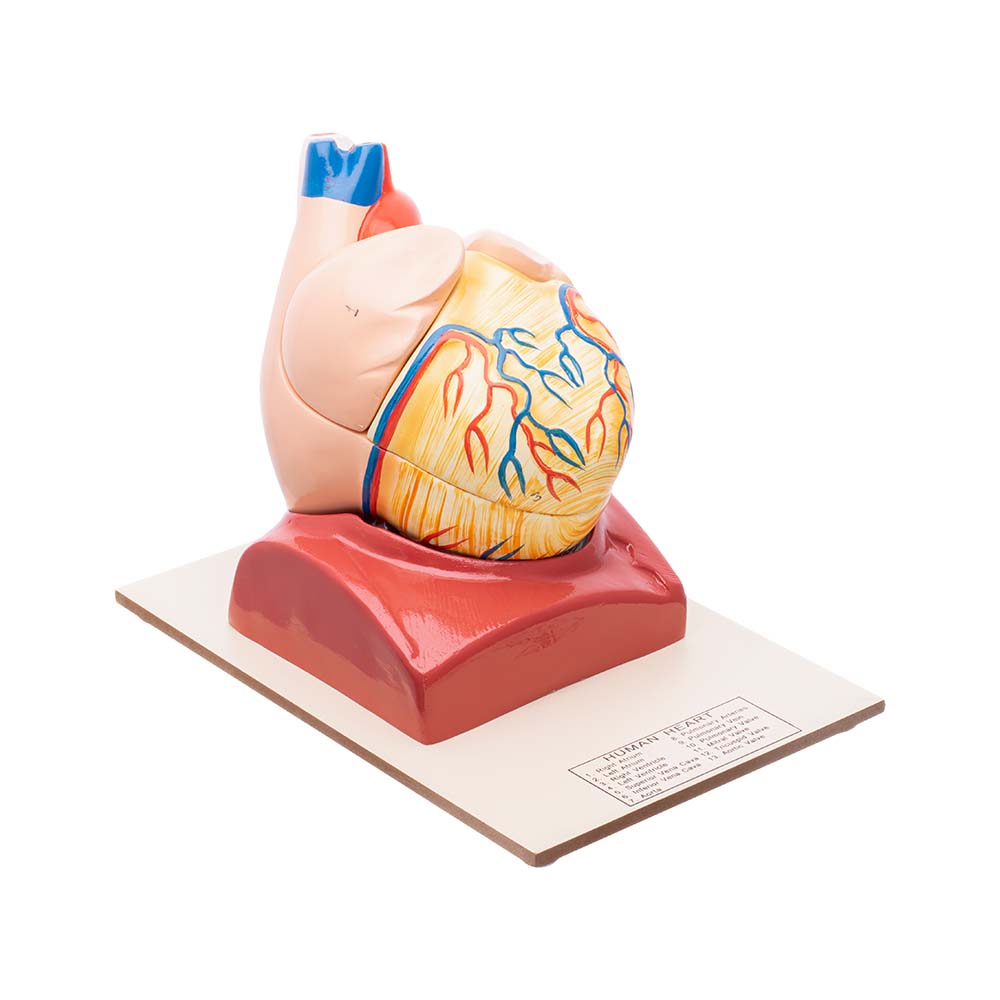 Extra large size and highly detailed model carefully coloured and finished. The heart is cut into 2 parts by a vertical line towards the level of the ventricular septum and separates into 2 parts after the arch of aorta and superior venacava have been removed. Both auricles and ventricles with the bicuspid and tricuspid semilunar valves as well as the sigmoid valves can be seen. Separates in 4 parts. On base with diaphragm and outline of the pericardium, with key card.