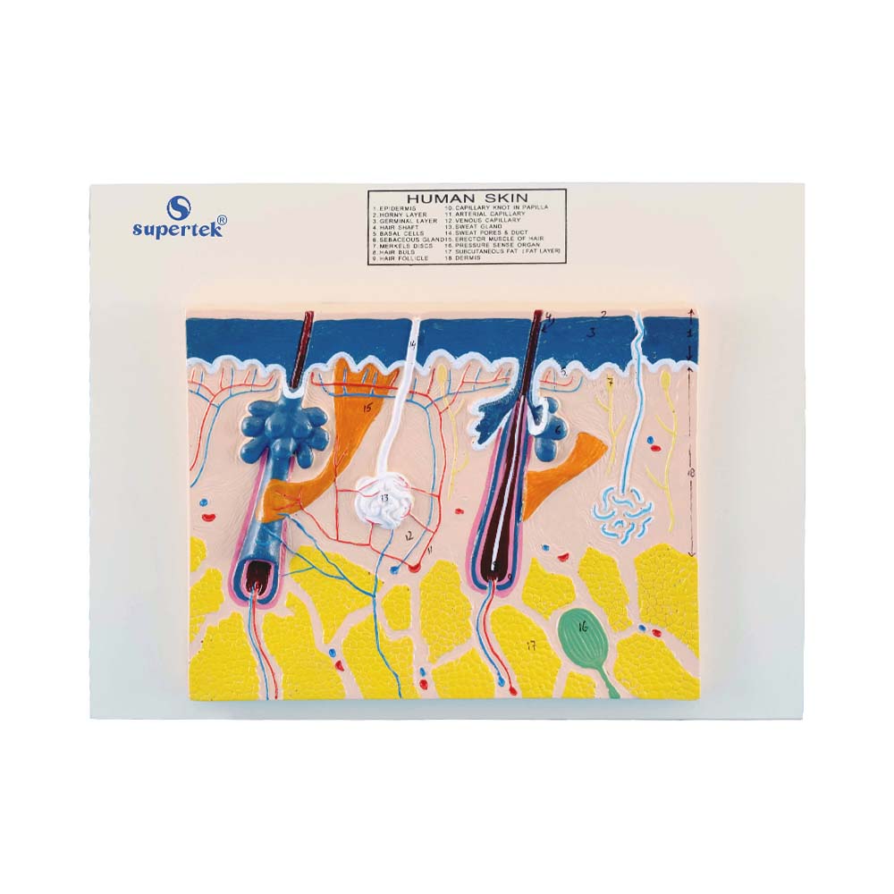 Enlarged 70 times, sectioned three layers of the hair covered skin of the head, showing hair follicles, with sebaceous sweat glands, receptors, nerves, and vessels, on base, with key card.