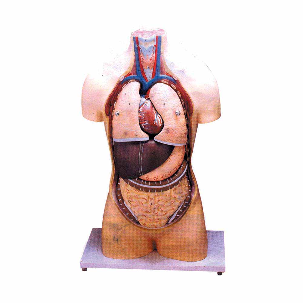 Full size,8 parts, shows all the major anatomical details. Visceral organs are individually detachable to expose the body cavity. Lungs, heart, liver, stomach and intestine are removable. Heart, lung, and kidney are sectioned to show internal details, sexless, on base, with key card.