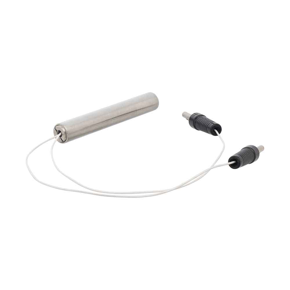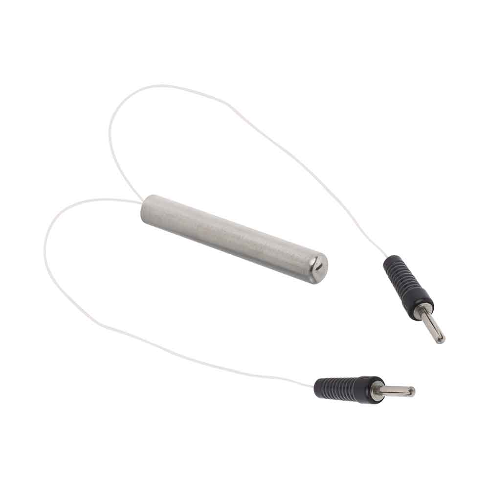 Specially designed for metal block calorimeters. The heating element is enclosed in a stainless-steel tube with two connecting leads, insulated with heat-resistant insulation. The stainless-steel enclosure features a sealed base to prevent water leakage and a threaded cap at the opposite end for the insertion of a porcelain pipe. Rated at 12 V, 50 W.