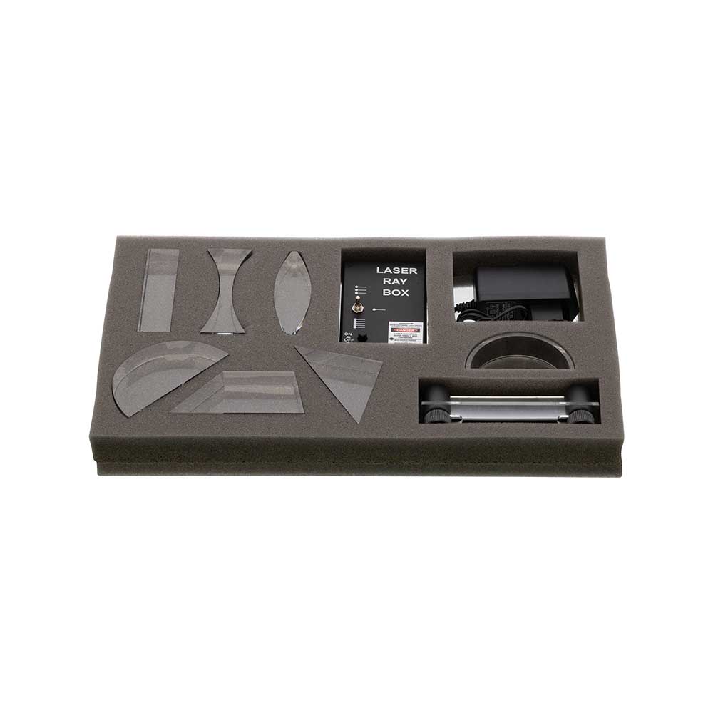 Laser Optics kit includes Laser Ray Box which produces the visible parallel “light rays” through the diode lasers housed in box. The Laser Ray Box projects 1, 3, or 5 parallel laser beams onto any flat surface ideal for optical ray viewing and analysis.