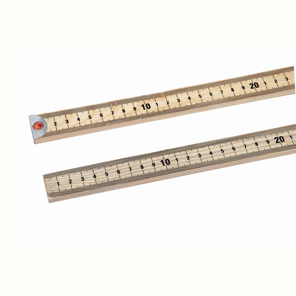 With metal ends, graduation dm, cm, mm on one side and inch, 1/8 inch on other side.