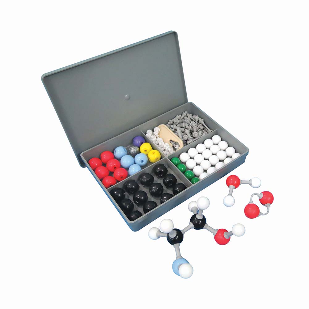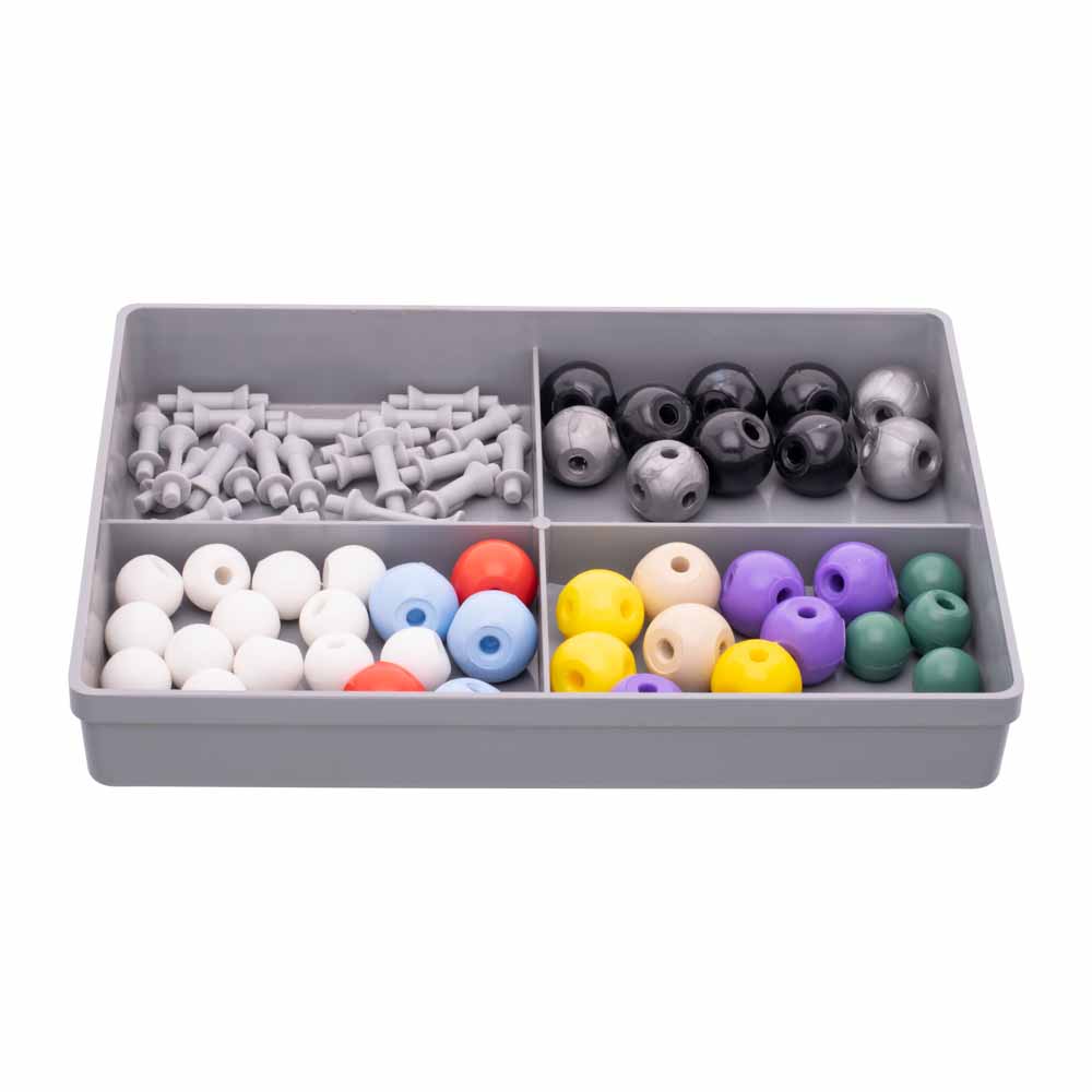 The set can be used to make models of many organic molecules and also to illustrate various forms of isomerism in organic systems. Atom parts are made of solid plastic spheres and are available with from 1 – 6 holes in the usual angular orientations. The contains 50 atoms of Different colors, 26 short white links, 26 medium grey links 31 mm and 10 long grey flexible links 46 mm. 1 Link Removers Beige color. Packed in a suitable box with teaching notes.