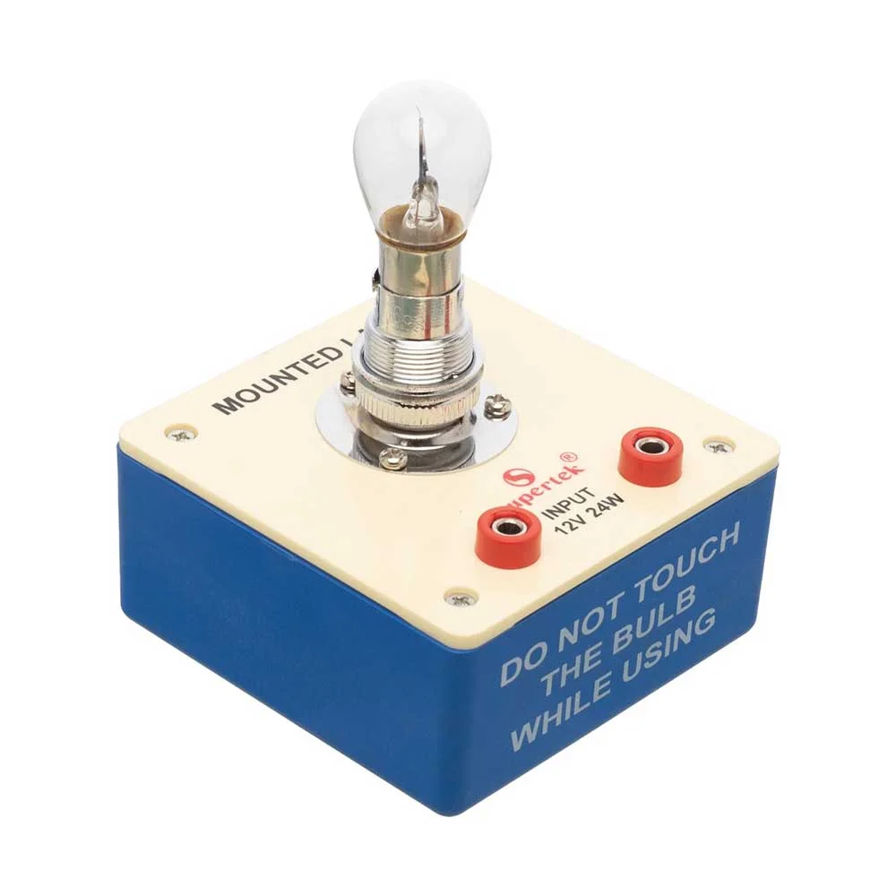 Mounted lamp unit with socket and bulb, fitted on an insulated base with 4 mm terminals for external connection. Operates on low voltage DC supply and is suitable for use in circuit experiments and demonstrations.