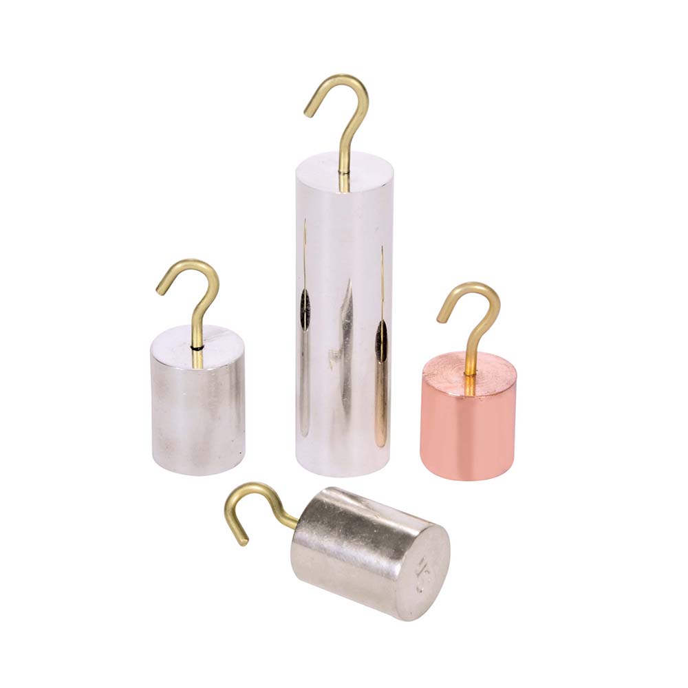 Set of 4 consisting of Aluminum, Copper, Stainless Steel and Zinc. With brass hook. Each cylinder is 19 mm in diam. (mass 50gm).