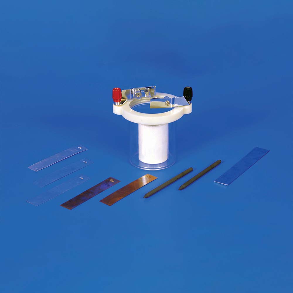 The set consists of a cell body of transparent plastic; a screw-on plastic ring; two brass electrode holders; 1 porous ceramic cup; ten electrodes: one each of aluminum, nickel, graphite, and iron; two each of copper, lead and zinc; and instructions.