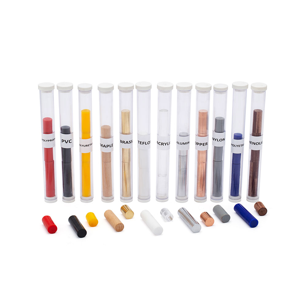 The colorful set consists of 48 specimens of twelve different types of material. The specimens are packaged in an acrylic tube as 12 sets of four. Set includes samples of Maple wood, Polypropylene, Nylon, Acrylic, Polyurethane, Phenolic, PVC, Copper, Brass, Teflon, Polyethylene and Aluminum. Students measure the mass and volume of different specimens and graph their masses as a function of volume. The graph produces a line for each substance, whose slope equals the density of the substance. Students learn that the density of a substance is constant even as its mass and volume change. With instructions