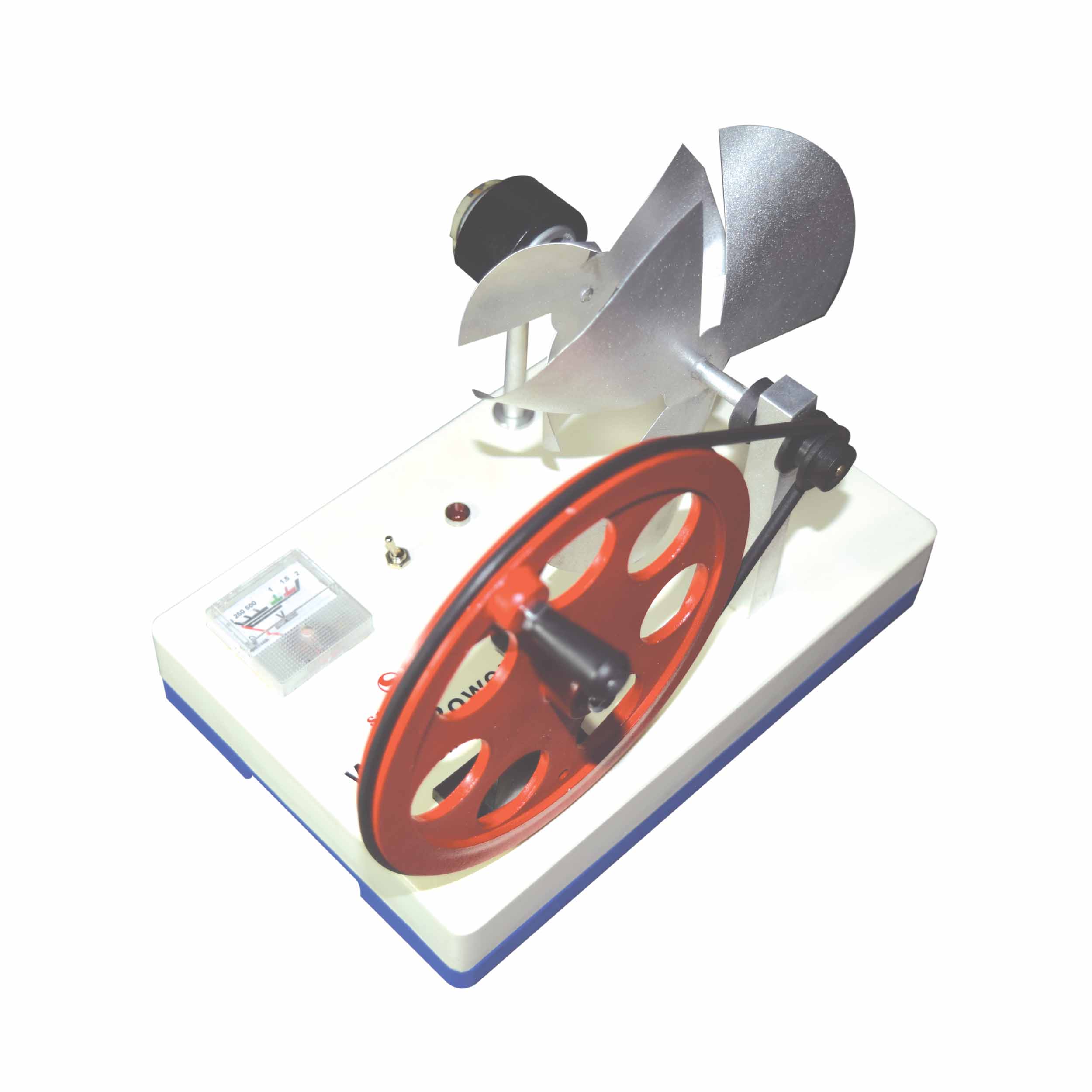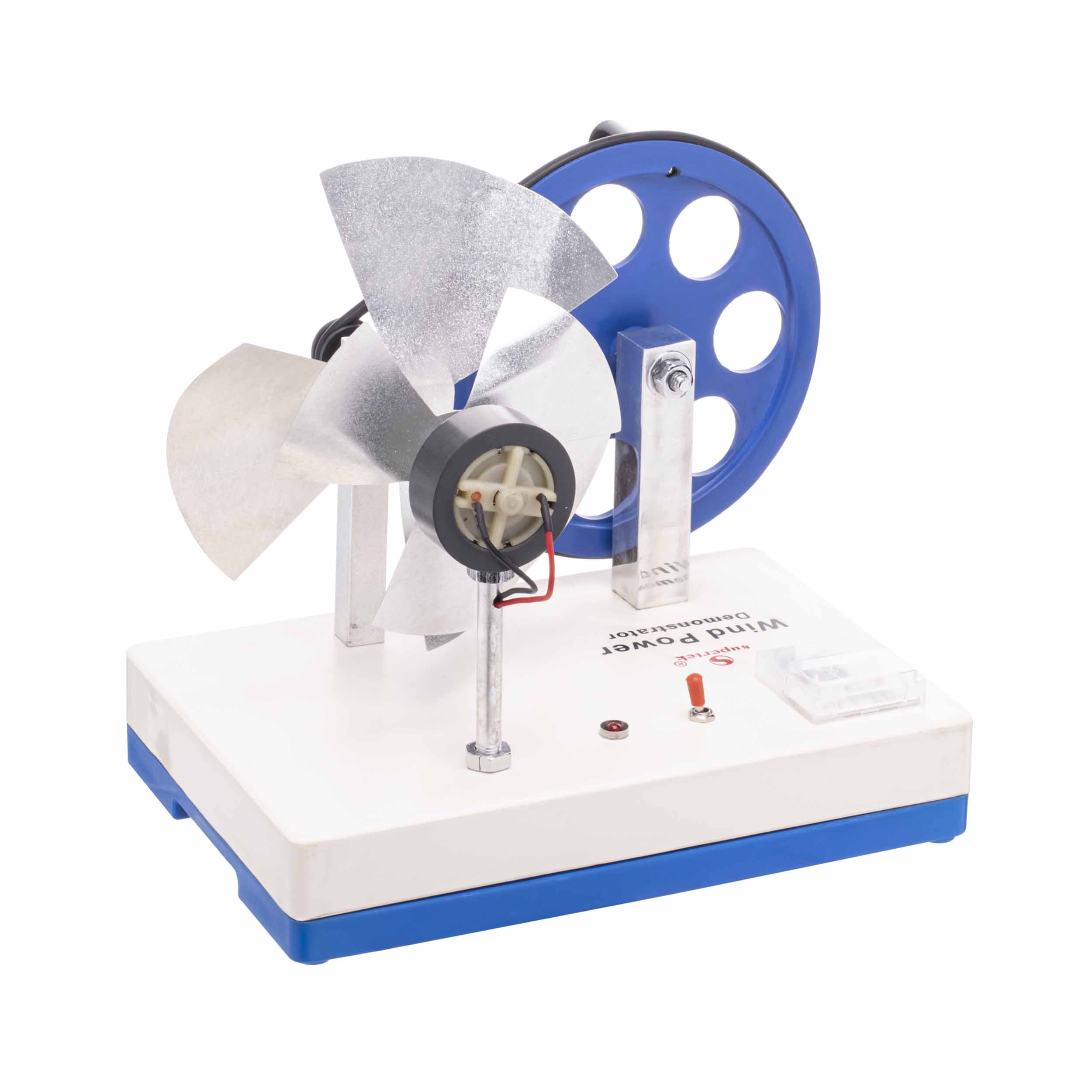 This wind power generator can be used to demonstrate the generation of electricity by a wind-powered turbine. Wind produced by the hand cranked fan subsequently turns a second fan connected to a generator. When the fan rotates, it produces electricity and lights up a small LED and a voltmeter. Instructions included.